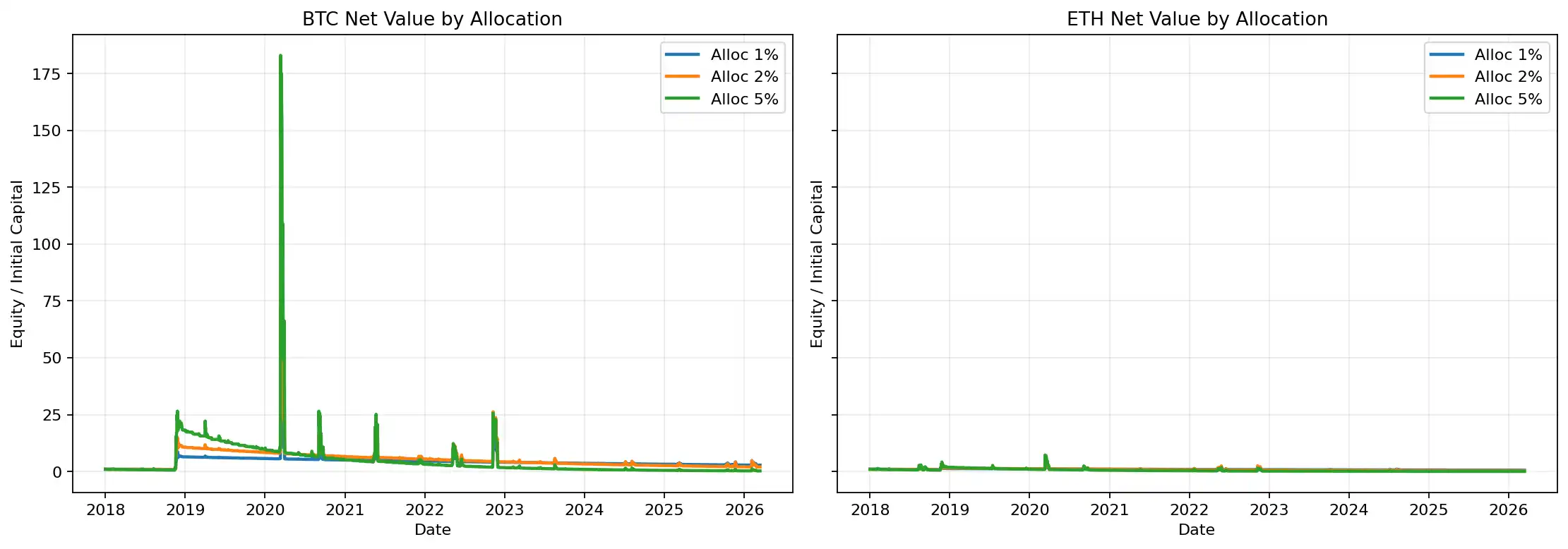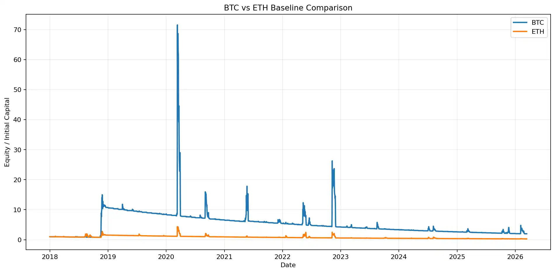 Figure 1 : La courbe de capital du portefeuille de référence montre une divergence nette des résultats à long terme entre le BTC et l'ETH, le BTC finissant par réaliser un rendement positif, tandis que l'ETH reste longtemps en baisse de valeur nette.