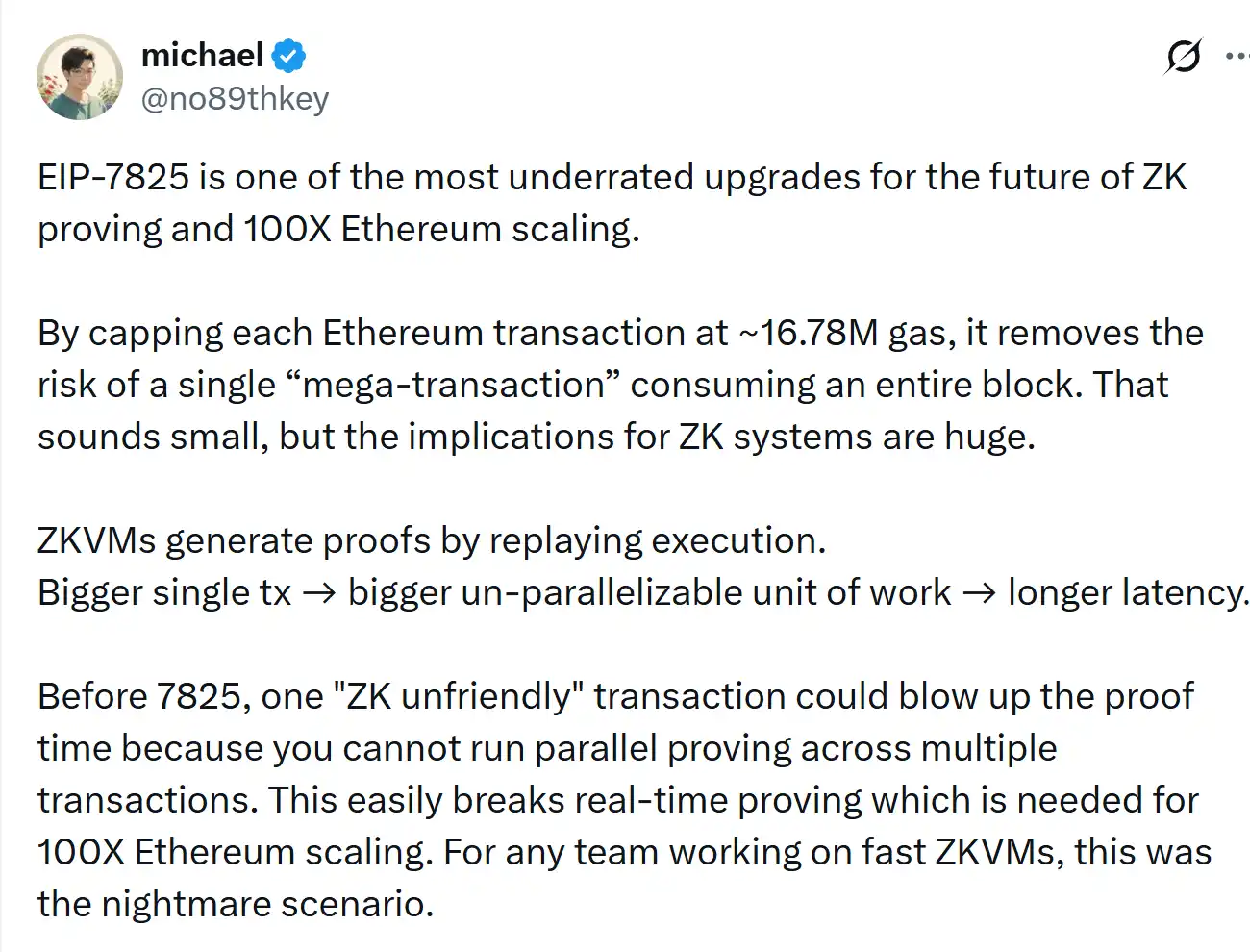 Mais au milieu de ce tumulte, il y a en fait une proposition discrète, l'EIP-7825, qui écarte le plus grand obstacle à la réalisation du zkEVM de L1 et de la preuve en temps réel pour Ethereum, et on peut même dire qu'elle pave discrètement la voie vers la finalité de l'Interop.