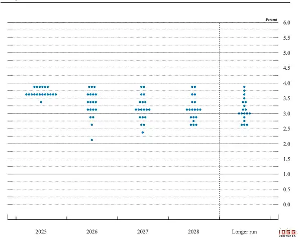 ▲ Source : Évaluations des participants du FOMC concernant la politique monétaire appropriée : Point médian de la fourchette cible ou niveau cible pour le taux des fonds fédéraux ; 10 décembre 2025