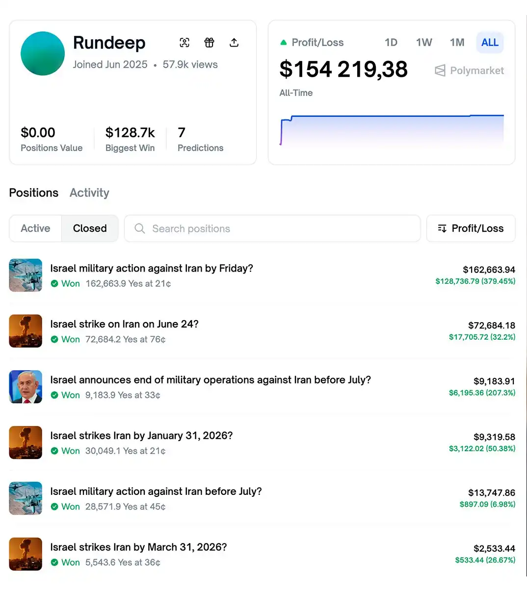 Comme le montre l'image ci-dessus, cet utilisateur nommé Rundeep est arrivé sur Polymarket en juin 2025 et a ensuite obtenu un taux de réussite de 100 % dans six marchés prédictifs concernant les actions militaires israéliennes, dont cinq fois en pariant alors que la probabilité était inférieure à 50 %, pour finalement réaliser un profit de plus de 150 000 dollars.