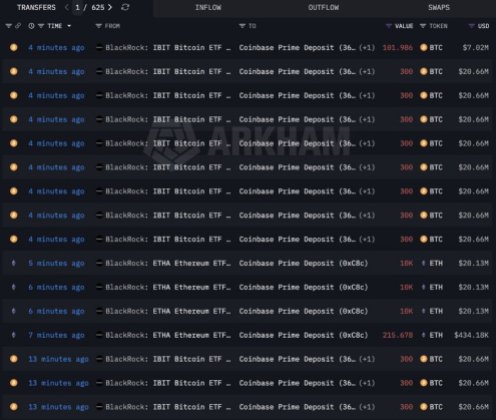 Les flux récents et les données on-chain montrent que le premier gestionnaire d'actifs a récemment déposé 234,3 millions de dollars supplémentaires en Bitcoin sur Coinbase Prime. Au même moment, BlackRock a transféré plus de 60,83 millions de dollars en ETH vers la même plateforme. Au total, les deux transactions étaient évaluées à environ 295,13 millions de dollars.