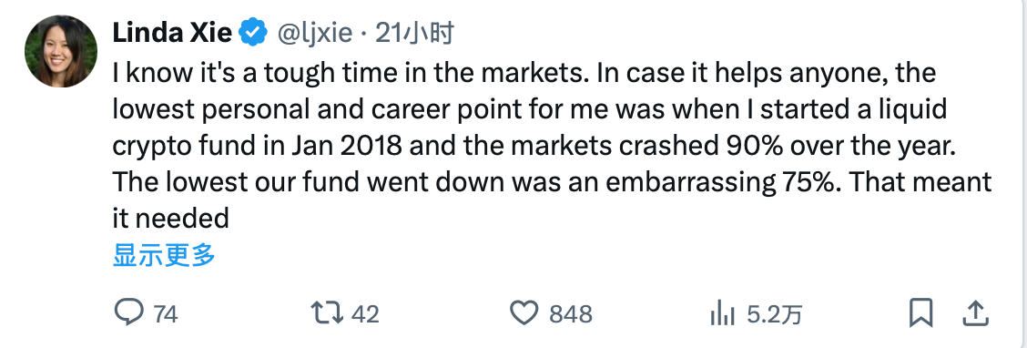 Je sais que l'environnement de marché actuel est difficile. J'espère que ces expériences pourront être utiles à certains. Pour moi, le point le plus bas, personnellement et professionnellement, a été de lancer un fonds de liquidité crypto en janvier 2018, alors que le marché chutait de 90 % cette année-là. Notre fonds a subi une baisse maximale embarrassante de 75 %, ce qui signifiait que le fonds devait quadrupler pour retrouver son capital initial.