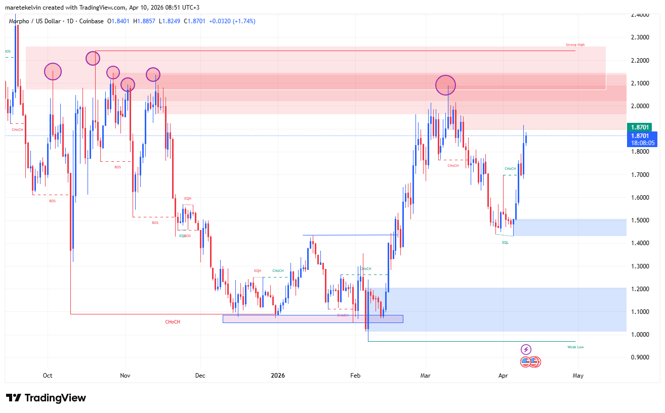 Sur le graphique quotidien, la structure de Morpho commence à changer. Le prix approche maintenant d'une zone d'offre clé entre 1,9 $ et 2,1 $.