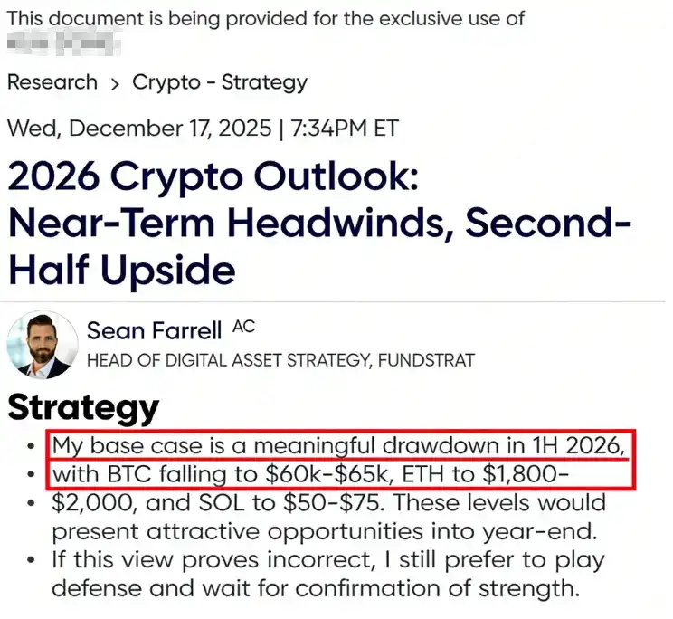 Cependant, lorsque le marché détourne son attention des caméras vers les documents internes des institutions, le ton change radicalement : dans les dernières perspectives stratégiques 2026 de Fundstrat, fondé par Tom Lee, destinées aux clients abonnés internes, un point de vue opposé est présenté, leur prévision de base estimant que les actifs cryptographiques pourraient subir une correction significative au premier semestre 2026, avec un objectif pour l'ETH dans une fourchette de 1800–2000 dollars. Cette divergence entre les déclarations "publiquement haussières" et "internement baissières" a propulsé Tom Lee et ses institutions associées sous les feux de la rampe.
