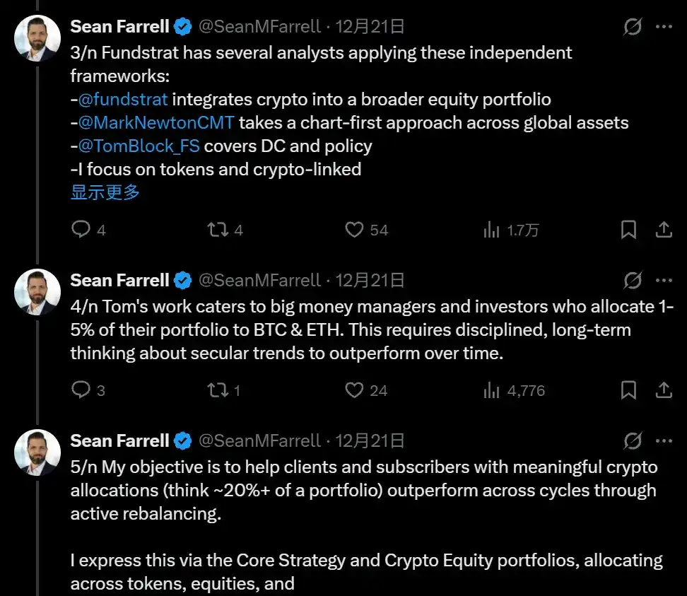 Il a déclaré que Fundstrat compte plusieurs analystes en interne, chacun utilisant son propre cadre de recherche et échelle temporelle indépendants pour servir les objectifs de différents types de clients ; parmi eux, les recherches de Tom Lee sont plus orientées vers les institutions de gestion d'actifs traditionnelles et les investisseurs à "faible allocation" (allouant généralement seulement 1%–5% de leurs actifs au BTC/ETH), mettant l'accent sur la discipline à long terme et les tendances structurelles, tandis que lui-même sert principalement les portefeuilles avec une proportion plus élevée d'actifs cryptographiques (environ 20%+). Cependant, Tom Lee lui-même, lors de ses déclarations publiques haussières sur l'ETH, n'a pas précisé qu'il s'adressait au groupe "allouant 1%–5% de ses actifs au BTC/ETH".