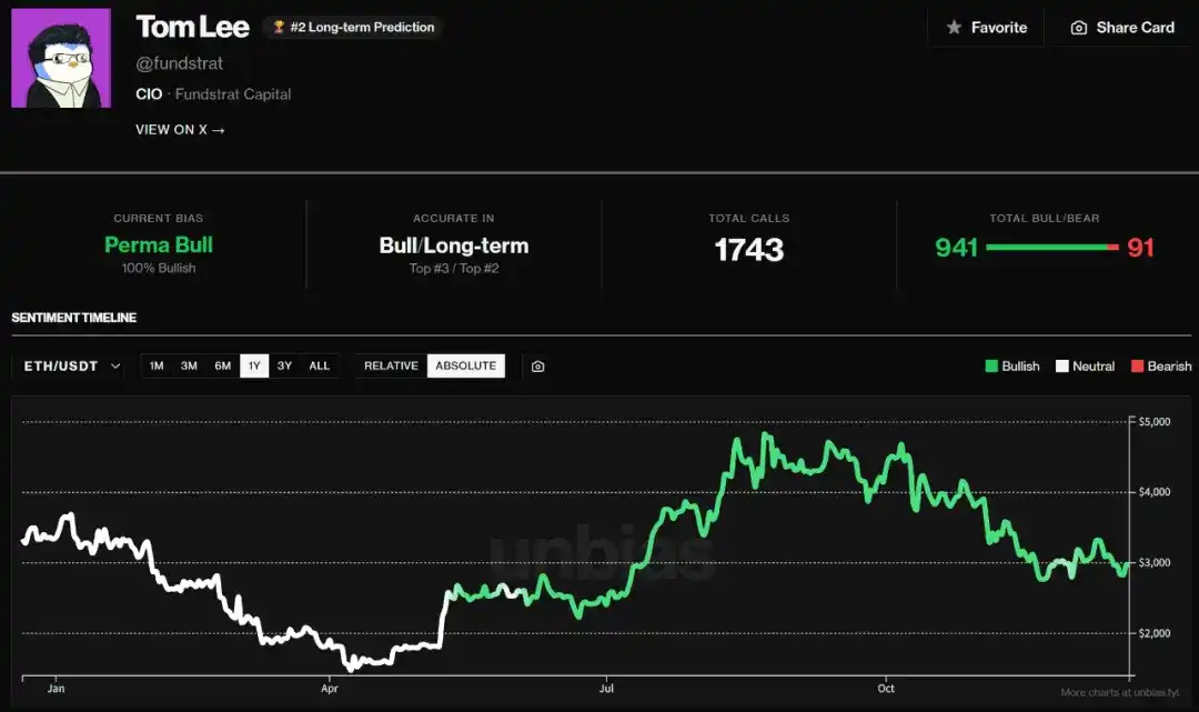 La liste ci-dessus de prédictions couvre presque tous les moments clés de 2025. Sur la page d'analyse Fundstrat de unbias fyi, Tom Lee est étiqueté comme "Perma Bull (Haussier perpétuel)". Chaque fois qu'il prend la parole, il donne au marché des objectifs de prix plus élevés et des perspectives de délai plus optimistes. Cependant, ces prévisions agressives sont loin de la réalité. Cette série de faits amène le marché à remettre en question la crédibilité du "devineur de Wall Street", Tom Lee.