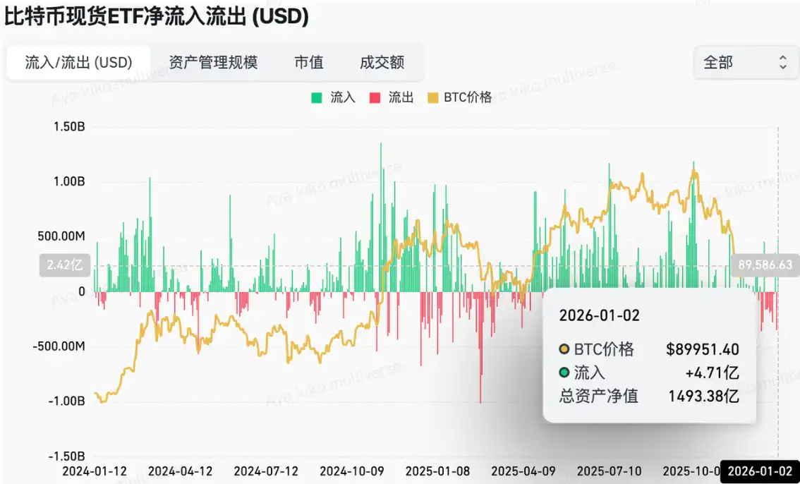 Selon les statistiques, pour la période du 29 décembre au 2 janvier, l'afflux net des ETF spot américains sur Bitcoin s'élève à : 458,7 millions de dollars ; au 2 janvier, le GBTC (Grayscale) a enregistré des sorties totales de : 25,193 milliards de dollars et détient actuellement 14,793 milliards de dollars. L'IBIT (BlackRock) détient actuellement 69,313 milliards de dollars. La capitalisation boursière totale des ETF spot américains sur Bitcoin est de : 119,546 milliards de dollars.