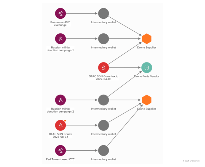 Des preuves on-chain montrent que des groupes de collecte de fonds de milices russes achètent auprès d'un fabricant de drones basé à Hong Kong et que des acheteurs de drones acquièrent de la liquidité auprès d'échanges de langue russe sans procédure Connaissez Votre Client (KYC), des échanges russes sanctionnés Garantex et Grinex, et un service de gré à gré (OTC) basé à la Federation Tower.