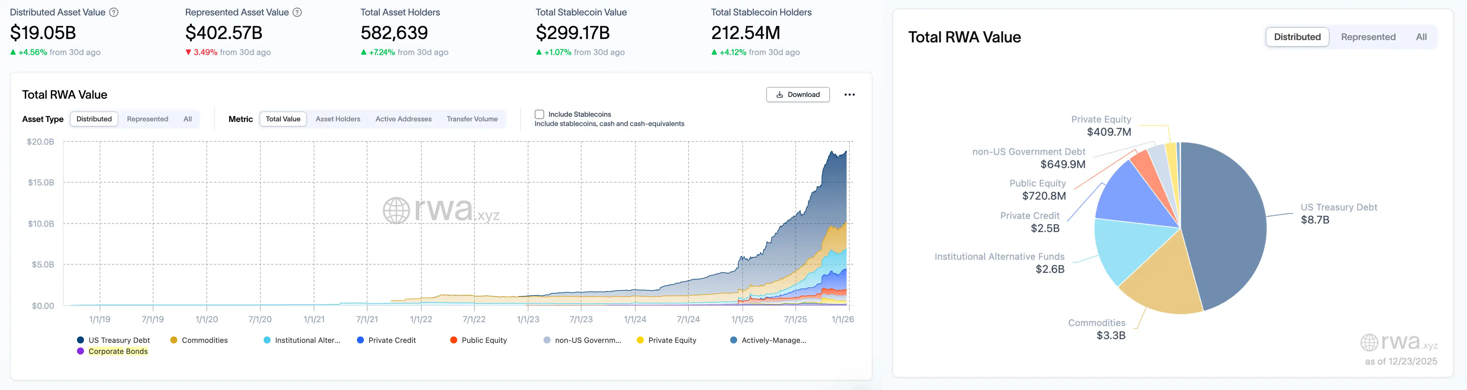 Selon le tableau de données de rwa.xyz, au 23 décembre 2025, la valeur totale sur chaîne des RWA (Distributed Asset Value) a continué sa croissance modérée cette semaine, passant de 18,74 milliards de dollars le 17 décembre à 19,05 milliards de dollars, soit une augmentation d'environ 310 millions de dollars, avec une hausse hebdomadaire de 1,65 %. Le volume global du marché des RWA au sens large a légèrement diminué, passant de 410,38 milliards de dollars à 402,57 milliards de dollars, soit une baisse de 7,81 milliards de dollars, représentant une chute de 1,9 %. Le nombre total de détenteurs d'actifs côté utilisateur est passé de 575 752 à 582 639, avec 6 887 nouveaux utilisateurs sur la semaine, soit une croissance de 1,2 %. Parallèlement, la base d'utilisateurs des stablecoins continue de s'élargir, le nombre de détenteurs passant de 210,72 millions à 212,54 millions, soit une augmentation d'environ 1,82 million de personnes, une hausse de 0,86 %. La capitalisation boursière totale des stablecoins a légèrement reculé, passant de 300,18 milliards de dollars à 299,17 milliards de dollars. Bien que légèrement inférieure (environ 1,01 milliard de dollars), elle reste globalement stable.
