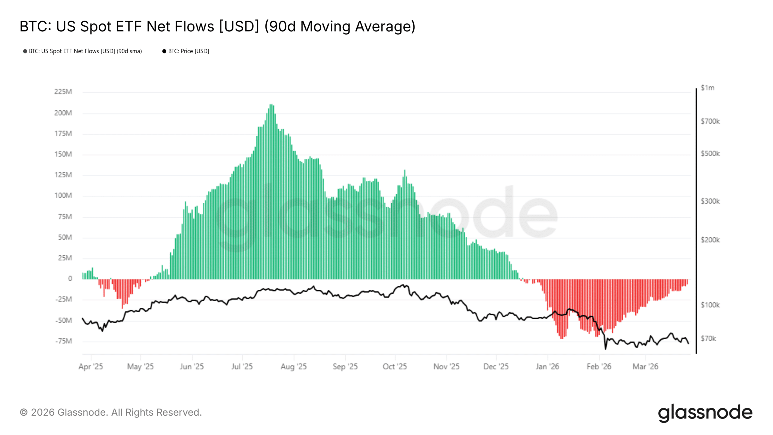 Lorsqu'on prend du recul, cependant, les sorties des FNB BTC au comptant avaient ralenti fin du premier trimestre 2026. Le flux moyen sur 90 jours a montré que la pression de vente est passée de 72 millions de dollars en janvier à 6 millions de dollars fin mars – une baisse de 92 % des rachats.