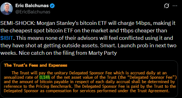- Le FNB Bitcoin de Morgan Stanley pourrait être lancé dans deux semaines, et ses frais de gestion les plus bas de 0,15 % pourraient déclencher une concurrence.