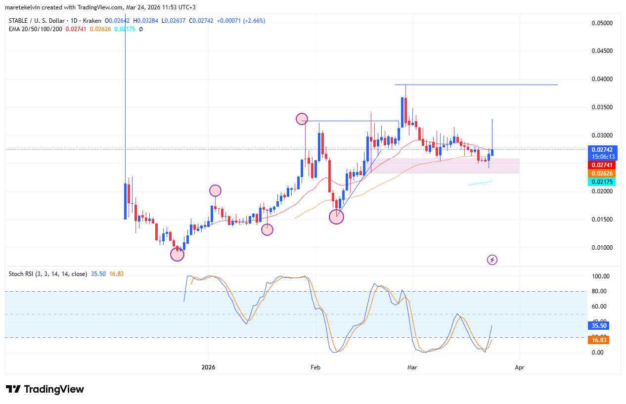 - Stable a gagné 10 % et testé une zone de demande clé près de 0,025 $. Le prix s'est maintenu au-dessus de l'EMA 20 jours mais a fait face à une résistance sous l'EMA 50 jours.