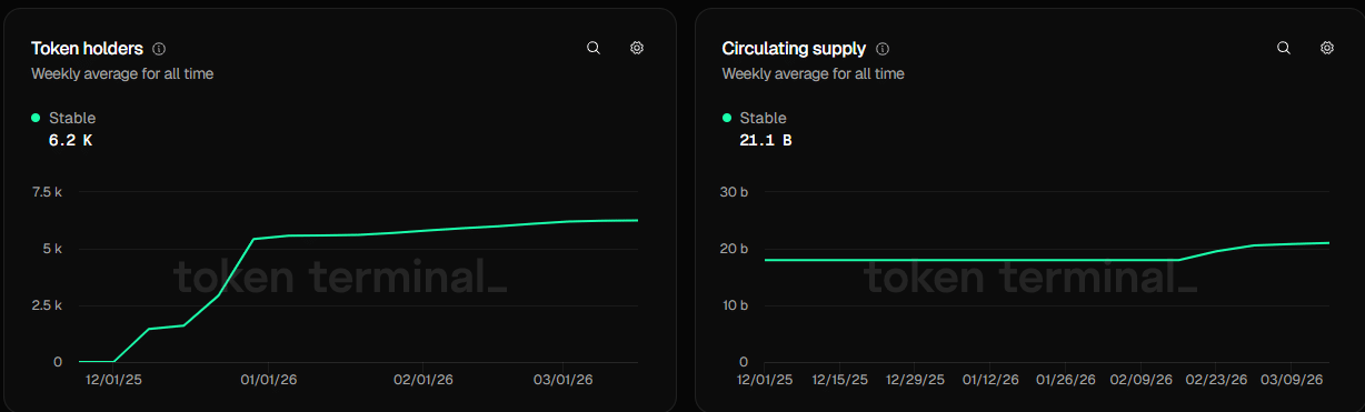 Au moment de la rédaction, le réseau comptait 6,2 k détenteurs et l'offre circulante s'élevait à 21,1 milliards.