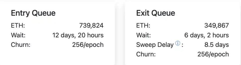 Selon les dernières données d'Ethereum Validator Queue, environ 739 824 ETH sont actuellement en attente pour entrer sur le réseau, avec un temps d'attente estimé à 12 jours et 20 heures ; la file de sortie ne compte que 349 867 ETH, nécessitant environ 6 jours pour être liquidée.