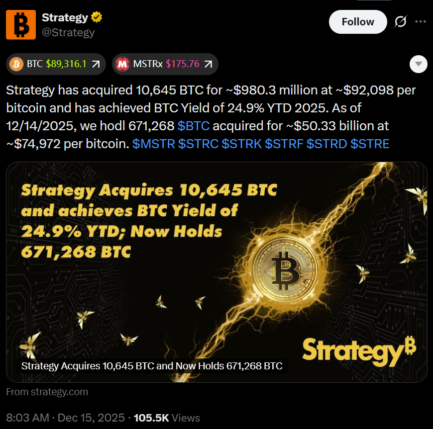 Strategy a annoncé lundi avoir acquis 10 645 Bitcoin (BTC) pour 980,3 millions de dollars, payant un prix moyen de 92 098 dollars par pièce.