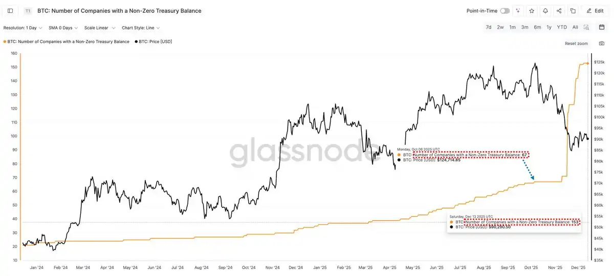 Il faut noter ici que le 6 octobre, le nombre d'entreprises détenant un « solde BTC non nul » n'était que de 67, et avec la correction profonde du BTC, ce nombre a soudainement explosé pour atteindre 153 actuellement. Cela signifie-t-il que de nouveaux acteurs de niveau entreprise entrent discrètement sur le marché pendant la baisse des prix ?