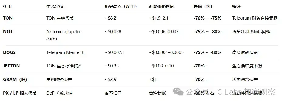 Les projets de l'écosystème TON qui étaient très populaires à l'époque ne sont plus très actifs maintenant, leurs prix ayant généralement reculé de plus de 70 % :