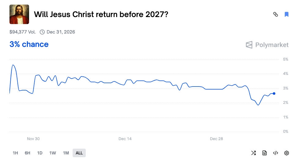 Le contrat sur le marché de prédiction Polymarket concernant le retour de Jésus-Christ en 2025 a attiré environ 3,3 millions de dollars de fonds avant son règlement le 31 décembre 2025. La probabilité du retour de Jésus est restée au-dessus de 3 % pendant longtemps. Étant donné que l'événement a finalement été jugé comme « non », les participants ayant parié sur « non » au plus haut du mois d'avril ont obtenu un rendement annualisé d'environ 5,5 %, surpassant même le rendement des obligations du Trésor américain (environ 4,1 % fin 2025 pour les obligations à 10 ans).