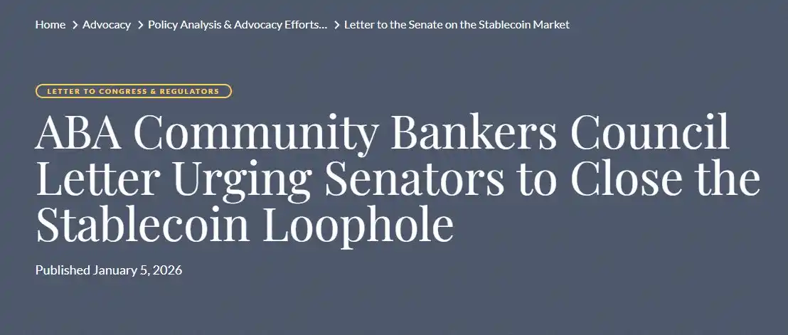 L'American Bankers Association (ABA) est le principal groupe à réclamer une interdiction totale de la rémunération des stablecoins. Dans une lettre ouverte publiée le 5 janvier, l'association a soutenu que l'interdiction de versement d'intérêts de la loi GENIUS ne devrait pas s'appliquer uniquement aux émetteurs, mais être interprétée largement et étendue aux parties associées. Ils militent pour que cette interprétation soit explicitement inscrite dans le projet de loi sur la structure du marché des cryptomonnaies.