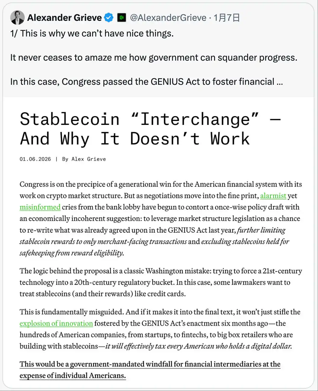 Néanmoins, avant que la commission sénatoriale américaine compétente n'examine le projet de loi sur la structure du marché des cryptomonnaies (visant à systématiser la régulation des cryptomonnaies) le 15 janvier, un débat sur « l'extension de l'interdiction de rémunération des stablecoins à la distribution » s'est intensifié.