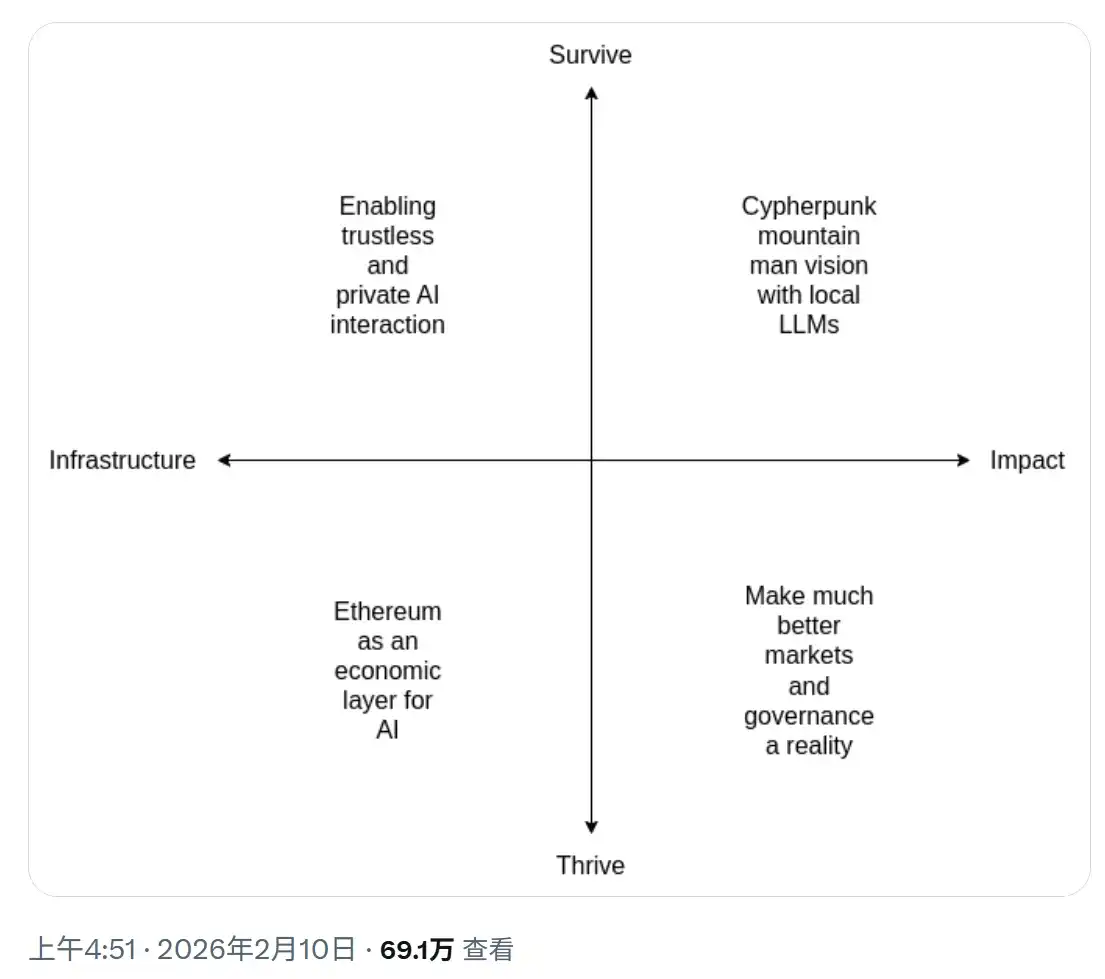 En février 2026, Vitalik Buterin a publié un post systémique sur X, révisant spécifiquement le cadre croisé « Crypto × IA » qu'il avait proposé deux ans auparavant.