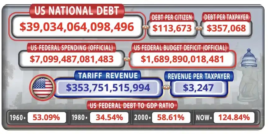 Dans le même temps, les recettes annuelles du gouvernement s'élèvent à environ 5 400 milliards de dollars, mais les dépenses approchent les 7 000 milliards de dollars. Environ 120 % des recettes fiscales sont absorbées par les prestations sociales de la génération du baby-boom, les intérêts de la dette historique et les dépenses de défense.