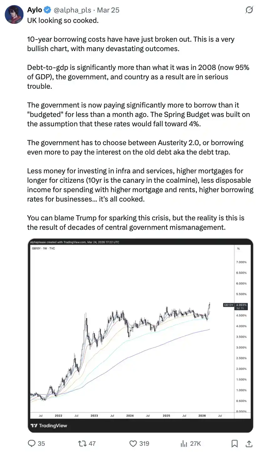 En regardant à l'échelle mondiale, l'écart de rendement entre les obligations du Trésor américain à 10 ans et les obligations japonaises ne cesse de se resserrer, tandis que le yen s'affaiblit, c'est le signal d'alarme classique d'une « spirale mortelle de la dette souveraine ».