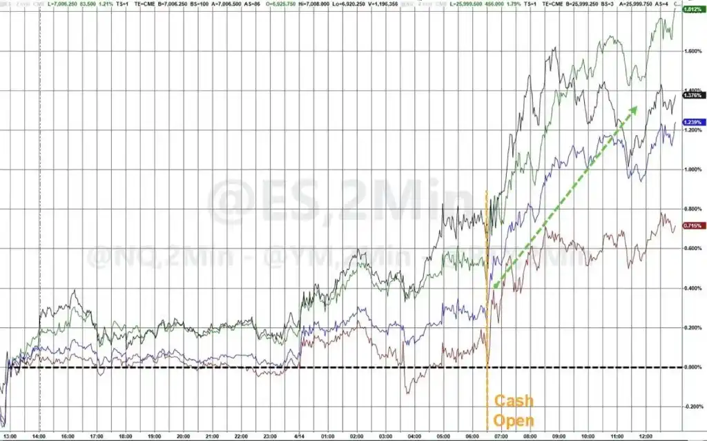 In the overnight market, leading companies in the artificial intelligence sector were also making their mark. The Mag 7 continued their strong performance, rising 3%, and have gained 15% over the past 10 trading days (rising in 9 out of those 10 days).