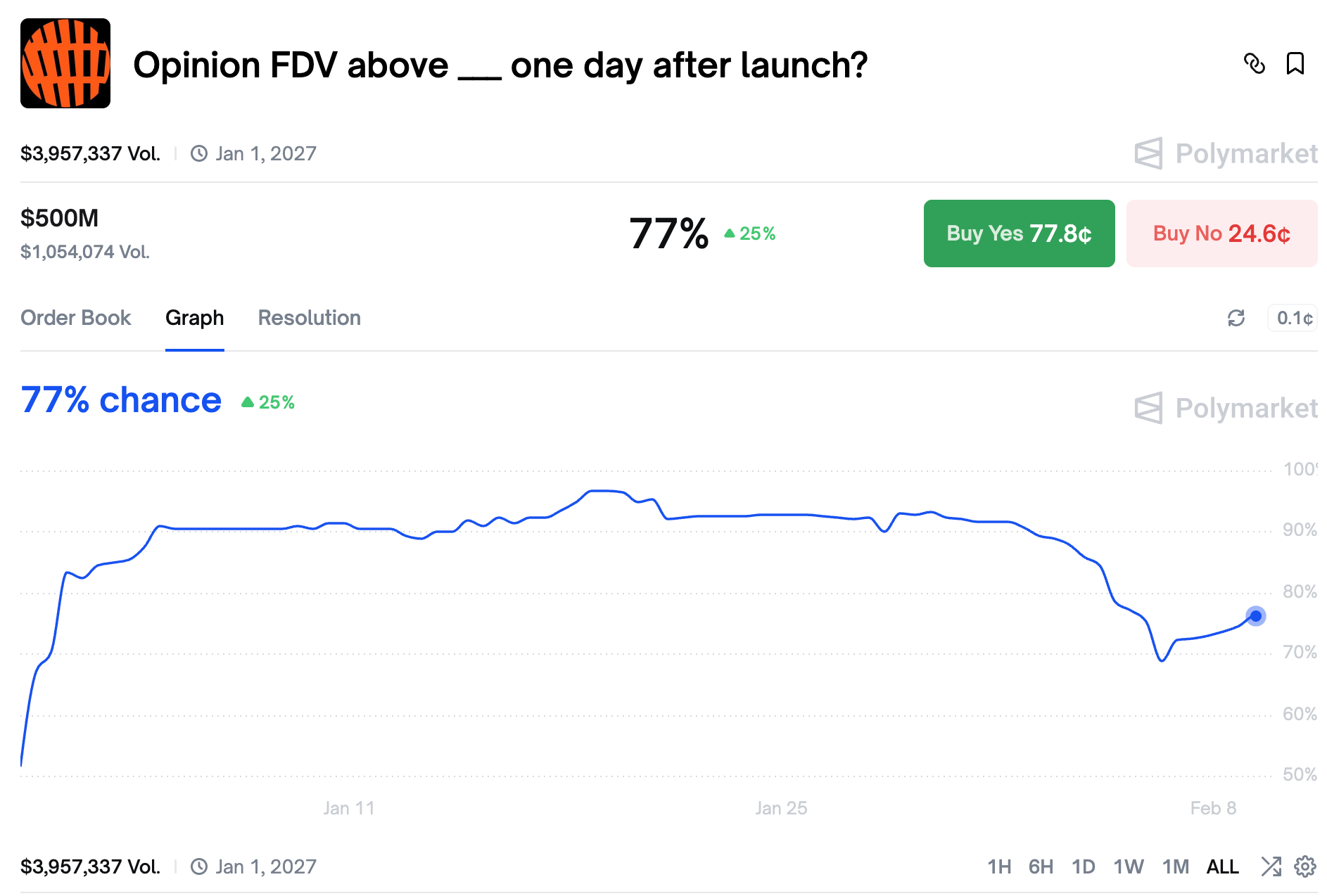 Du point de vue des attentes du marché, la communauté maintient également un niveau d'attention élevé concernant la performance du TGE d'Opinion. Les données du site Polymarket montrent que la probabilité que l'événement de pari "La FDV (Valeur Totale Diluée) d'Opinion dépasse 500 millions de dollars le premier jour de cotation" est actuellement de 76%, pour un volume de transactions avoisinant les 4 millions de dollars. Dans l'environnement actuel de performance globale faible du marché des altcoins, le maintien d'une probabilité de prédiction aussi élevée reflète également l'attente générale du marché que le projet pourrait bénéficier d'un fort soutien des prix lors de son lancement initial.