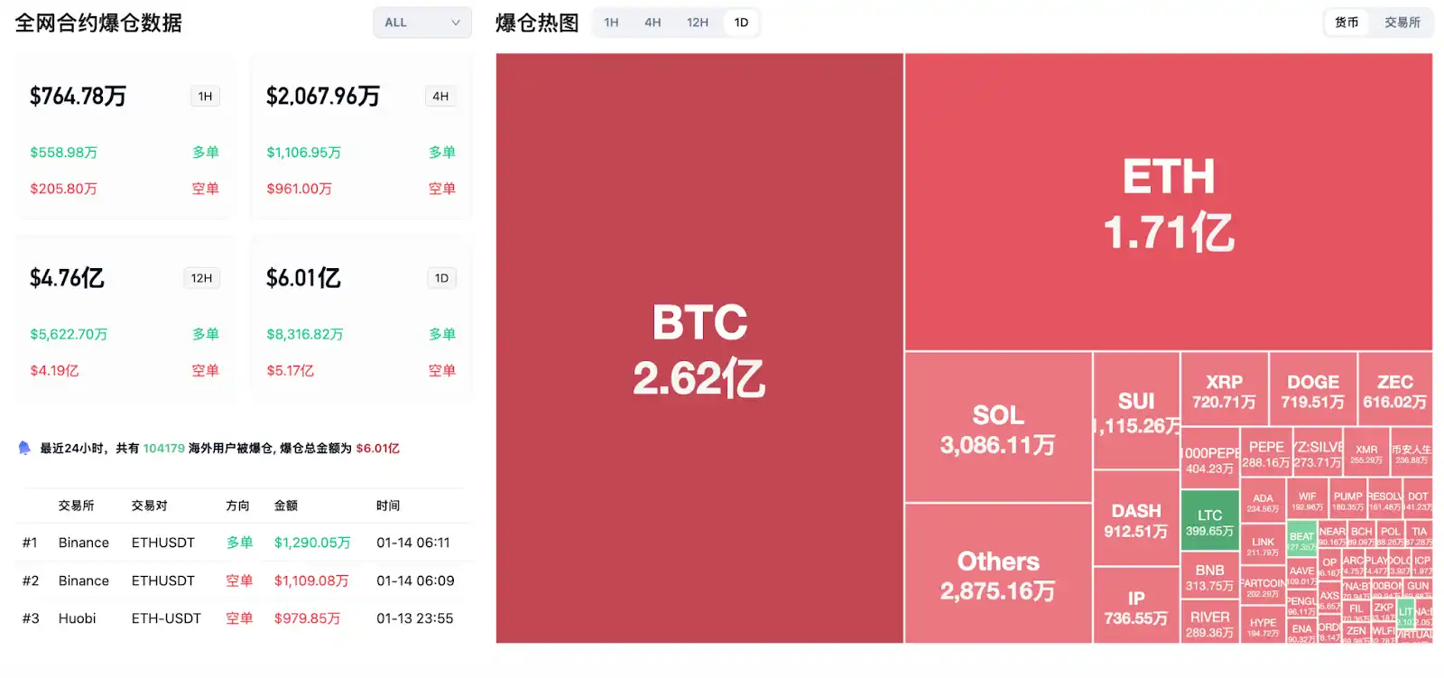 Données de liquidation sur 24h : 104 179 personnes liquidées dans le monde, montant total des liquidations de 601 millions de dollars, dont 262 millions de dollars pour BTC, 171 millions de dollars pour ETH, 30,86 millions de dollars pour SOL.