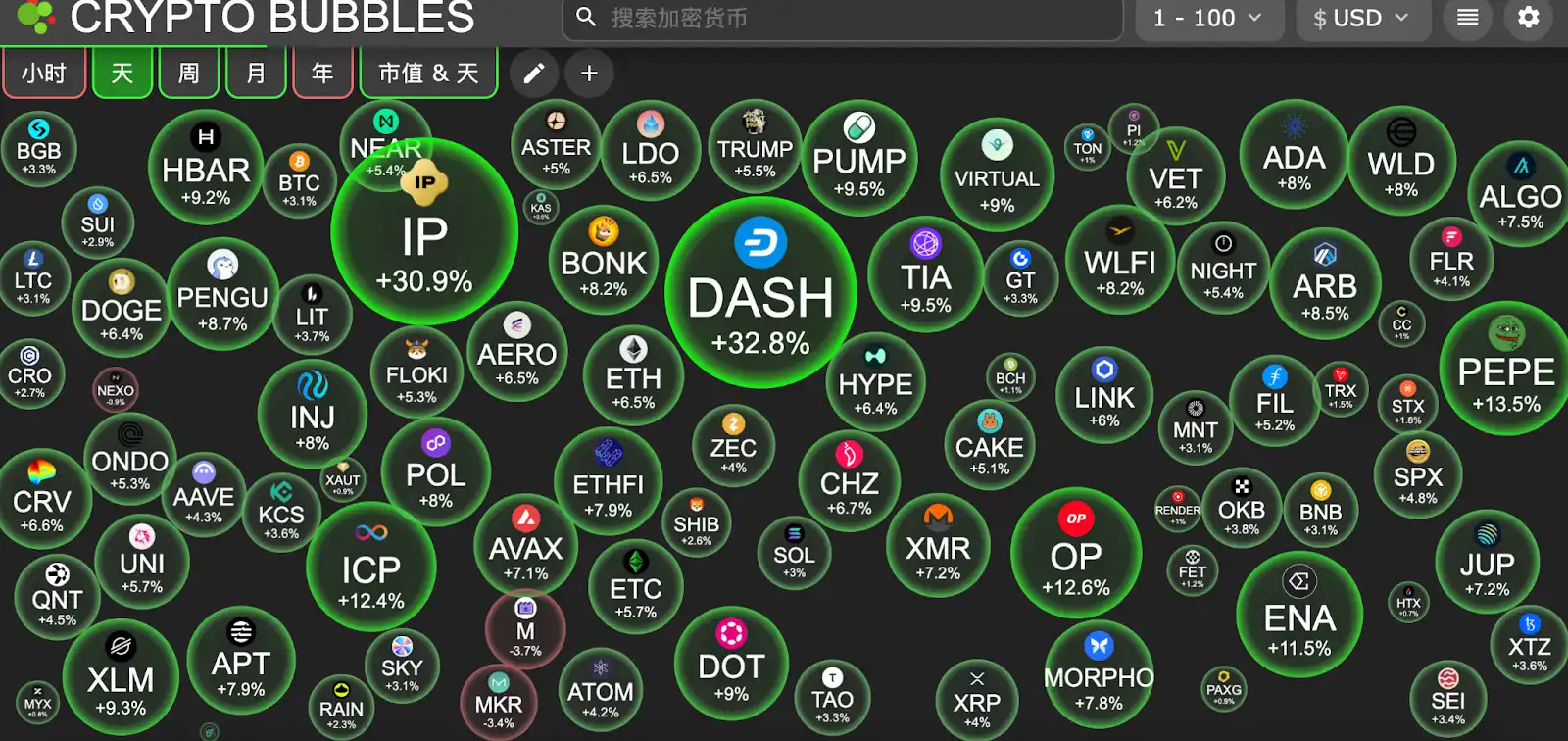 Plus fortes hausses du top 100 des cryptos aujourd'hui : Dash +32,7%, Story +30,7%, Pepe +13,5%, Optimism +12,7%, Internet Computer +12,3%.