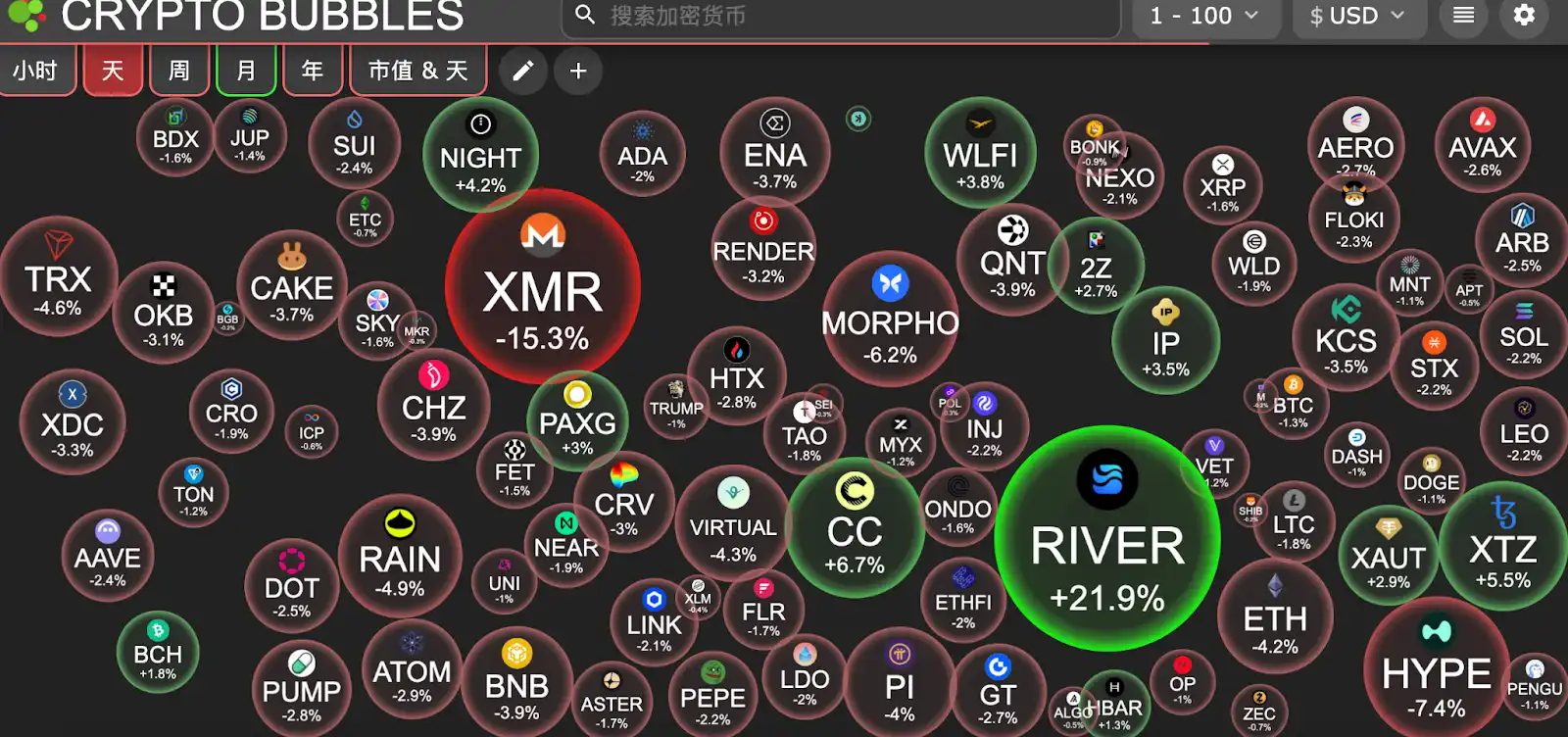 Plus fortes hausses du jour parmi les 100 premières cryptomonnaies par market cap : River +21,9 %, Canton Network +6,7 %, Tezos +5,5 %, Midnight +4,2 %, World Liberty Financial +3,8 %.