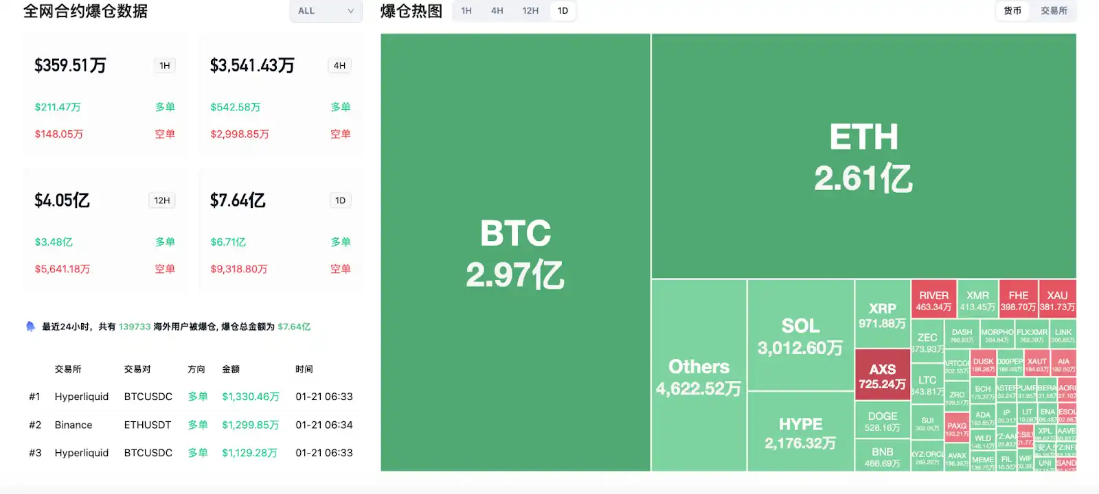 Données de liquidation sur 24h : 139 733 personnes liquidées dans le monde, montant total des liquidations de 764 millions de dollars, dont 297 millions de dollars pour BTC, 261 millions de dollars pour ETH, 30,12 millions de dollars pour SOL.