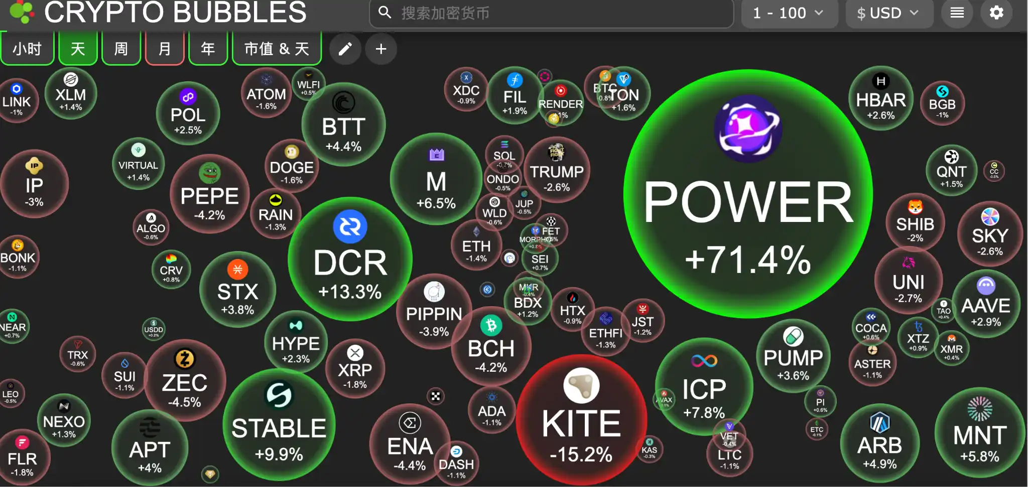 Plus fortes hausses des 100 premières cryptos par market cap aujourd'hui: Power Protocol +71,4%, Decred +13,3%, Stable +9,9%, Internet Computer +7,8%, MemeCore +6,5%.