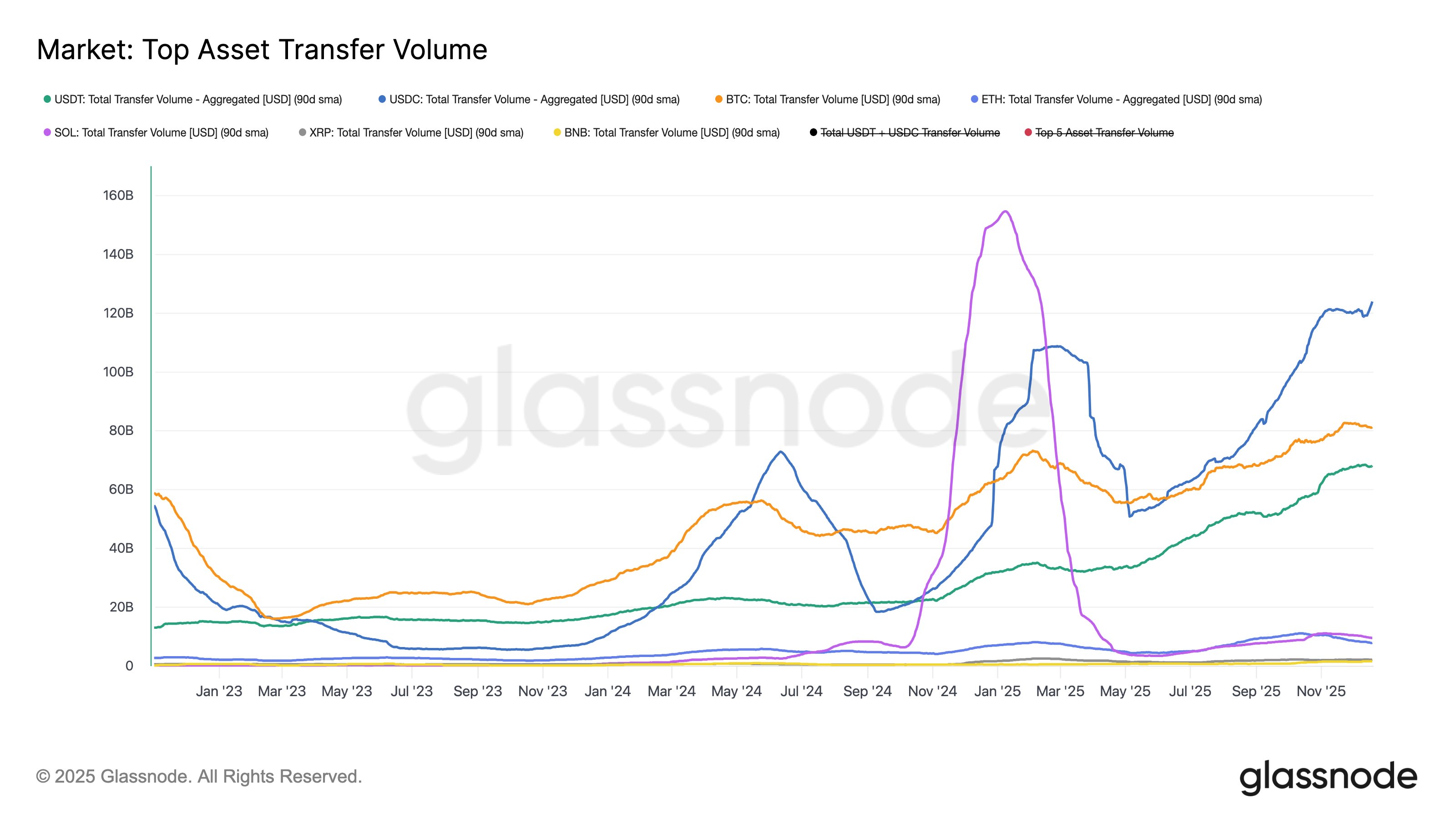 Les deux principaux stablecoins combinés représentent 192 milliards de dollars d'activité transactionnelle chaque jour, ce qui est presque le double du volume de transfert que connaissent les cinq principales cryptomonnaies non stables. « Les stablecoins sont devenus les principales voies de liquidité, tandis que les transferts d'actifs natifs restent relativement modestes », a déclaré Glassnode.