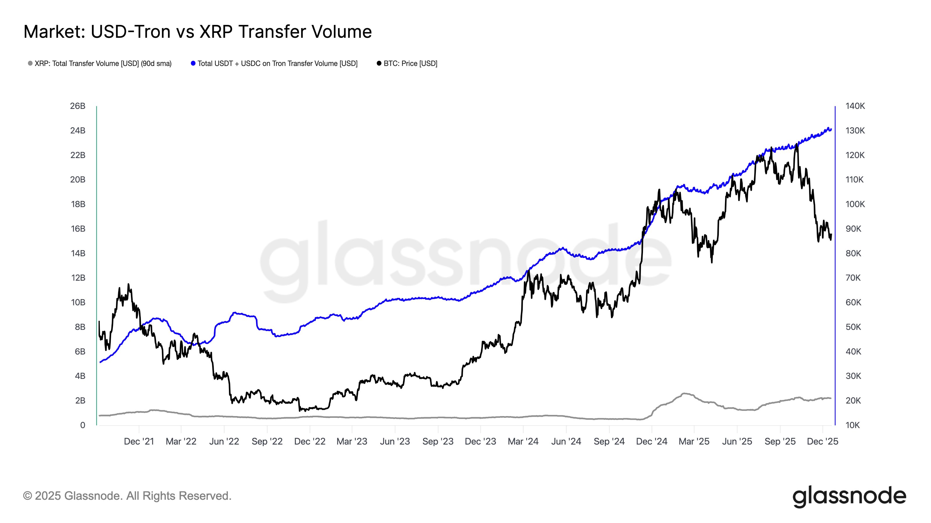 Les données montrent que le volume des transactions de l'USDT et de l'USDC sur Tron est désormais plus de 10 fois supérieur au volume des transferts de l'ensemble du réseau XRP.