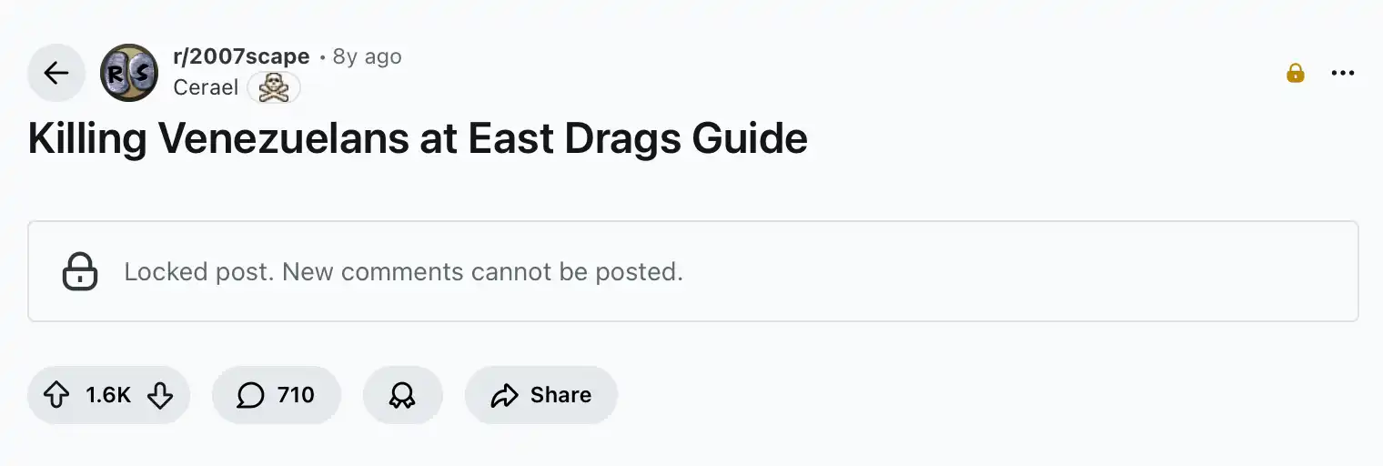 Les joueurs vénézuéliens ont commencé à utiliser OSRS pour subvenir à leurs besoins au moins en 2017, voire plus tôt, car en septembre 2017, un post Reddit apprenant aux joueurs d’OSRS comment traquer les joueurs vénézuéliens dans la « zone des dragons de l’Est » du jeu est devenu viral, devenant par la suite un meme important dans l’histoire d’OSRS :