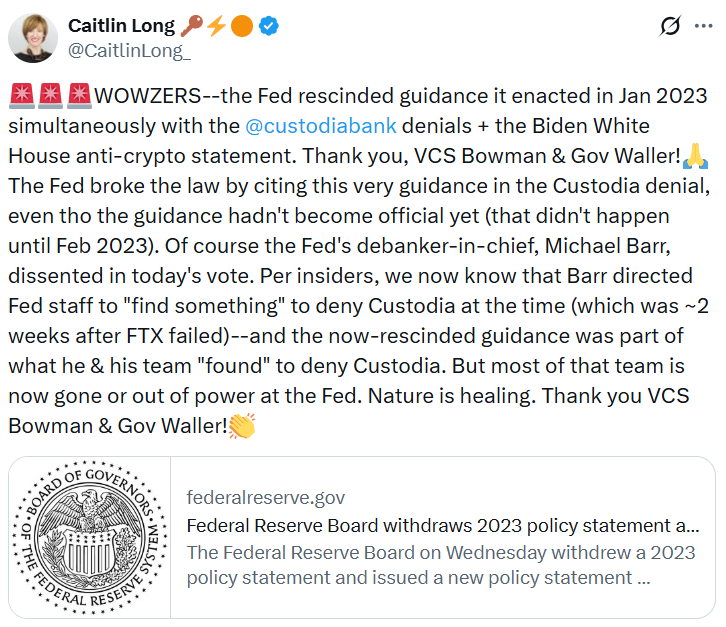 Caitlin Long, la PDG de Custodia Bank, une banque axée sur la crypto, a salué cette décision dans un post sur X mercredi, expliquant que l'orientation de 2023 était la raison pour laquelle la demande de compte principal de son institution avait été précédemment refusée.