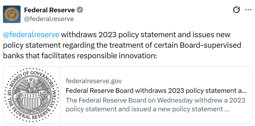 La Réserve fédérale américaine a retiré une orientation de 2023 qui limitait la manière dont les banques supervisées par la Fed, y compris les banques non assurées, s'engageaient avec la crypto, alors que les régulateurs américains continuent de pivoter positivement vers les actifs numériques.