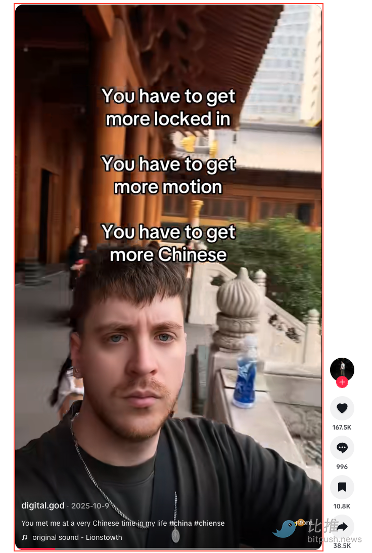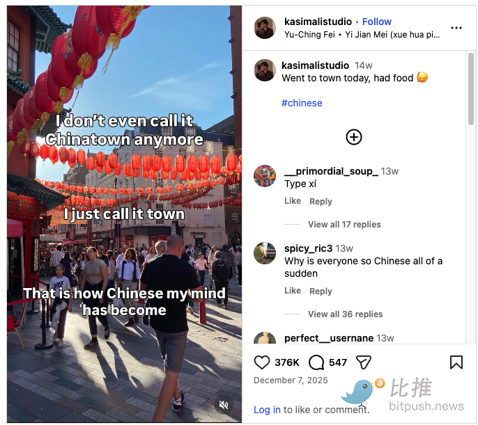 L'idée de « devenir chinois » était au départ une blague un peu absurde, mais elle a évolué pour devenir un meme en ligne teinté d'aspiration. L'imitation légère a lentement cédé la place à des créateurs « débloquant » leur personnalité « oncle chinois » (en gros : impassible, peu loquace, montrant occasionnellement son ventre), ou découvrant qu'ils sont « sur le point » d'acheter une veste ouatée à fleurs – ce qu'une spectatrice a appelé la « tenue tatie chinoise ». Aujourd'hui, de nombreux internautes « découvrent soudainement » qu'ils sont en fait chinois, ou proclament une transformation complète : « Maintenant, je ne l'appelle même plus 'Chinatown', je l'appelle juste 'la rue' », dit une légende de vidéo, « Voilà à quel point ma pensée est chinoise. » Ce meme en ligne s'est popularisé au point que même les comportements les plus quotidiens sont qualifiés de « vie ultime à la chinoise » – l'influenceur américain Hasan Piker a filmé une vidéo devant la skyline de Shanghai,特意 portant des chaussettes avec ses tongs.