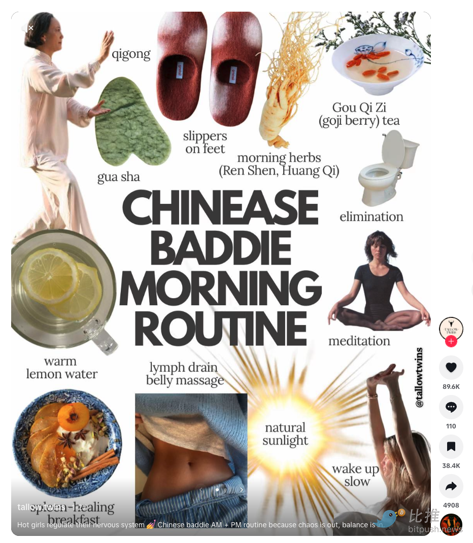 Récemment, à l'occasion du Nouvel An lunaire, ce type de contenu a explosé. Un infographique présentait une « routine matinale relaxante de fille cool chinoise » (中式舒缓 est un jeu de mots intentionnel avec 'Chinese' écrit 'Chinease') – incluant « herbes matinales », « méditation », « gua sha », ainsi que des images : un pack abdominal (annoté « massage abdominal de drainage lymphatique ») et des toilettes (simplement annotées « excretion »).