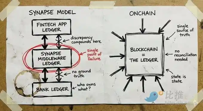 L'espace crypto a connu ses propres échecs catastrophiques : FTX, Celsius, Terra/Luna. Mais ces échecs provenaient d'entités de garde centralisées qui utilisaient les actets déposés pour des paris à haut risque. Ils ont échoué pour la même raison que Synapse : des systèmes opaques où personne ne pouvait voir ce qui se passait réellement jusqu'à ce qu'il soit trop tard.