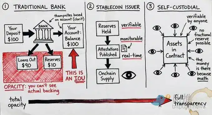 Mais cet argument omet souvent un point : le stablecoin lui-même comporte un risque d'émetteur. Un contrat intelligent rempli d'USDC ne vous sert à rien si son émetteur, Circle, fait face à une crise réglementaire ou à une ruée sur ses réserves. Détenir de l'USDT est essentiellement un pari sur la capacité de Tether à gérer ses réserves. L'auto-garde élimine le risque d'intermédiaire, mais pas le risque d'émetteur.