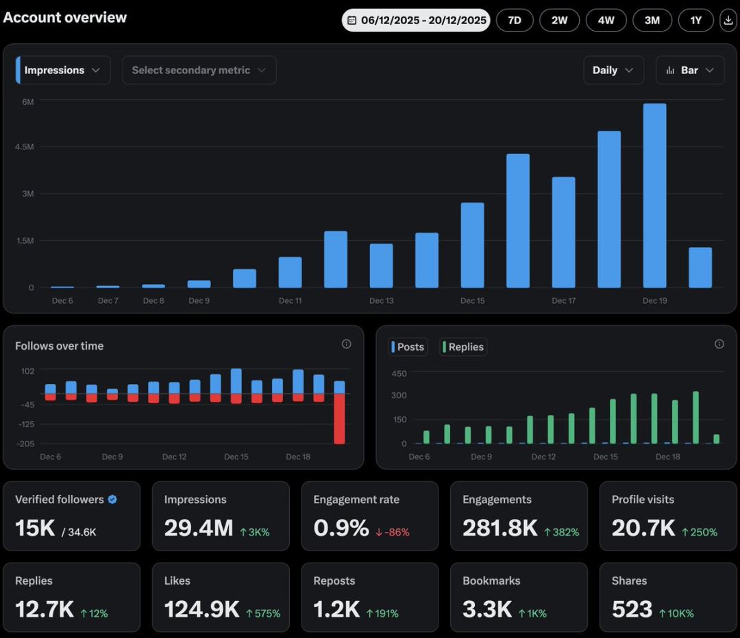 Voici les résultats concrets : 28,9 millions d'expositions, 267,7k interactions, 119,5k likes, 11,8k commentaires, 3,1k sauvegardes, 20k visites sur le profil, 37,5k abonnés, dont environ 41% d'utilisateurs certifiés.