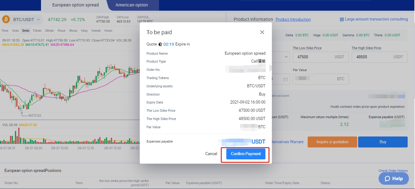 ऑप्शन अनुबंध की ऑर्डर जानकारी की पुष्टि करें, जैसे कि अंतर्निहित परिसंपत्ति, मात्रा, इस्तेमाल की गई कीमत, लाभ-अलाभ कीमत, और प्रीमियम। यह प्रीमियम ऑप्शन अनुबंध खरीदने के लिए शुल्क है। ऑप्शन प्रीमियम का भुगतान करने के लिए “पुष्टि करें” पर क्लिक करें। प्रीमियम का भुगतान करने के बाद, संबंधित राशि की कटौती ऑप्शन खाते से कर ली जाएगी। इसी के साथ, सिस्टम ऑप्शन अनुबंध की लाभ-अलाभ कीमत की गणना करता है। कॉल ऑप्शन के लिए, अंतर्निहित कीमत के लाभ-अलाभ कीमत से ऊपर जाने होने पर लाभ कमाया जा सकता है। पुट ऑप्शन के लिए, अंतर्निहित कीमत के लाभ-अलाभ कीमत से नीचे जाने होने पर लाभ कमाया जा सकता है। यूज़र लाभ-अलाभ कीमत के आधार पर लाभ कमाने के लिए एडवांस में ऑप्शन का प्रयोग कर सकते हैं।