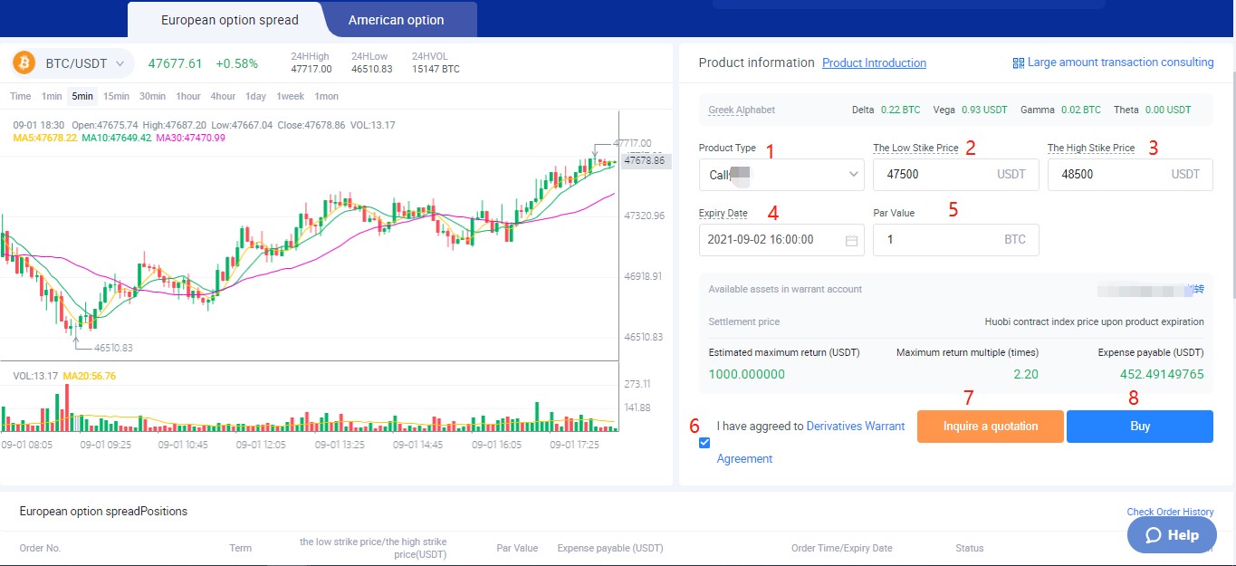 HTX Options के वेबसाइट संस्करण में दो प्रकार के उत्पाद हैं, यूरोपियन ऑप्शन स्प्रेड और अमेरिकन स्टैंडअलोन ऑप्शंस। यूरोपियन ऑप्शन स्प्रेड के साथ, यूज़र कम खर्च पर लागू कीमत को अनुकूलित कर सकते हैं। अमेरिकन स्टैंडअलोन ऑप्शंस के साथ, यूज़र को केवल एक स्ट्राइक कीमत तय करना होता है। कुल मिलाकर, अमेरिकन स्टैंडअलोन ऑप्शंस में लेन-देन की सुविधा, जल्दी लागू करना, और कम खर्च में असीमित लाभ पेश किया जाता है।