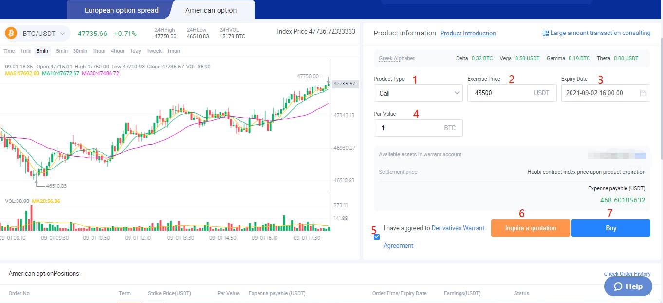 इस पेज पर, यूज़र्स ऑप्शन प्रकार/समाप्ति की तारीख चुन सकते हैं, लागू कीमत तय कर सकते हैं, मात्रा दर्ज कर सकते हैं, और [पूछताछ] पर क्लिक कर सकते हैं। सिस्टम ऑप्शन के लिए प्रीमियम की गणना करेगा, और यूज़र ऑर्डर देने के लिए [खरीदें] पर क्लिक कर सकते हैं।