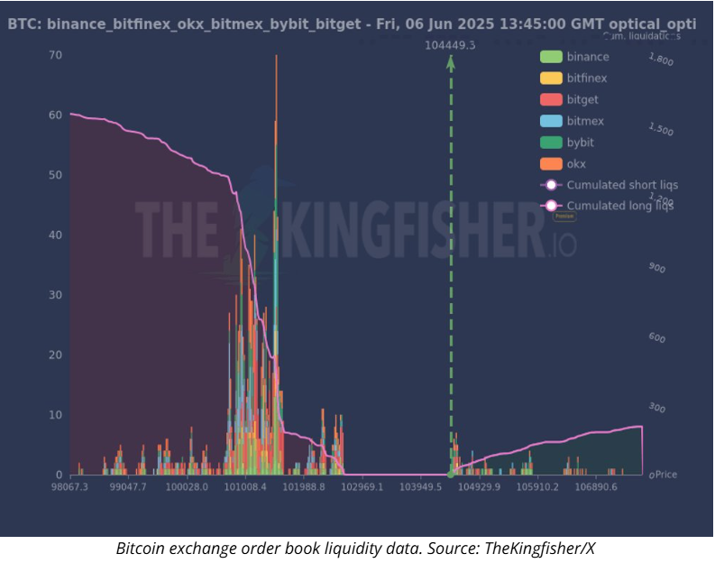 “That's a huge magnetic zone below current price. In contrast, short liquidations above ~104.5k are minimal.”