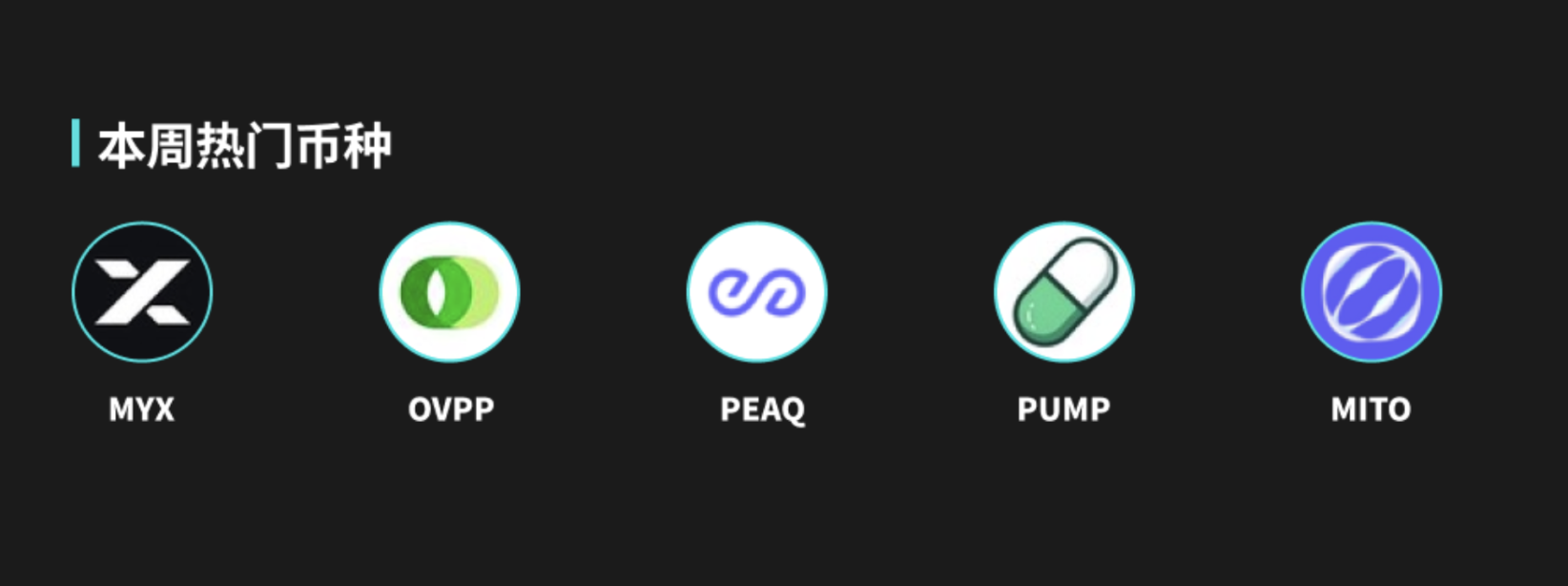 热门币种方面,MYX、OVPP、PEAQ、PUMP 和 ITO 都有着不俗的表现。MYX 本周价格上涨 196.1%,24 小时交易量 16.3M。OVPP 价格上涨 136.2%,最高价格为 0.178 USDT。PEAQ 和 PUMP 本周分别上涨 77.3% 和 68.7%。