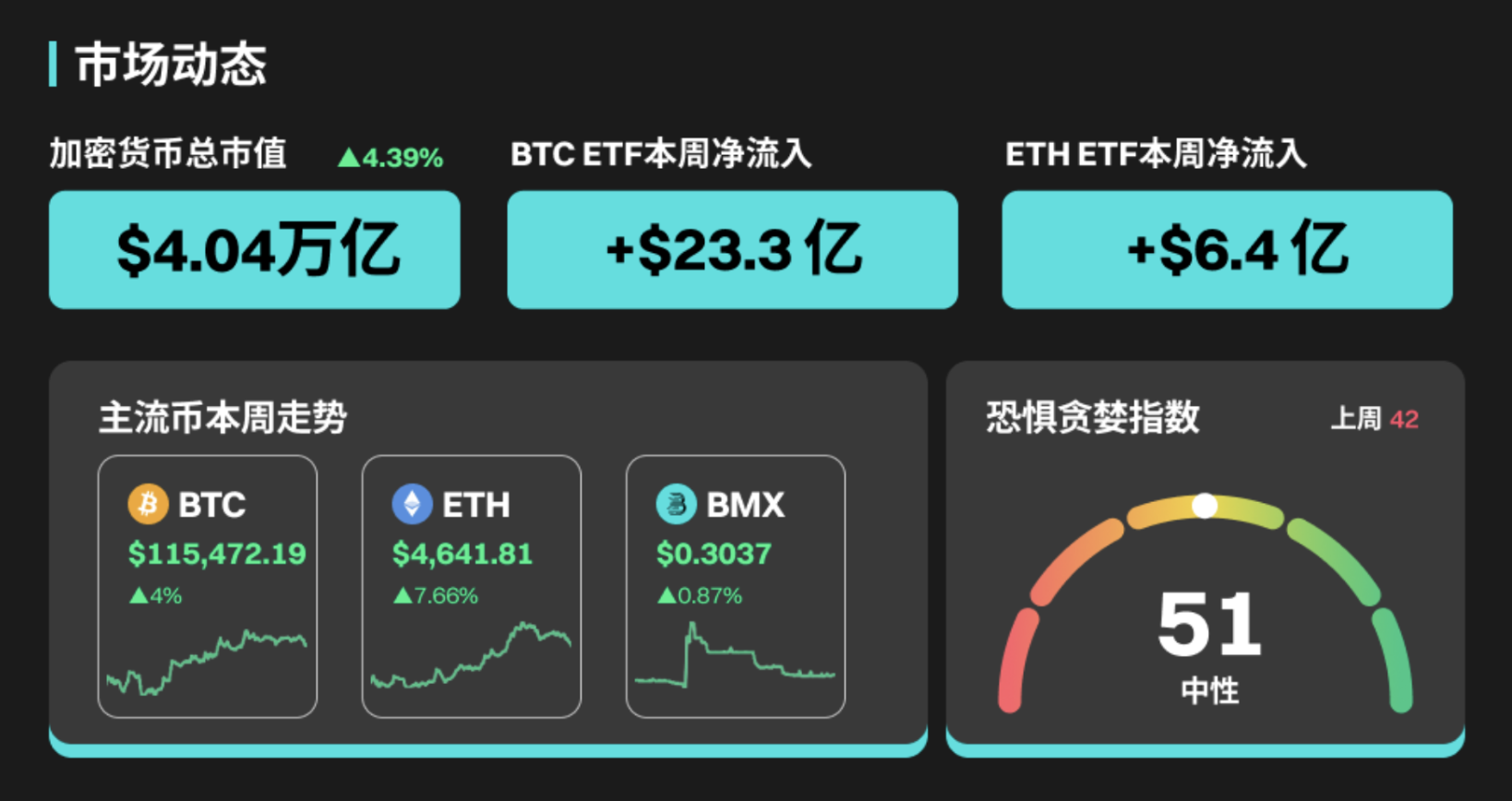 据 BitMart 9 月 15 日市场行情报告,过去一周加密货币总市值为 4.04 万亿,较上周上涨了 4.39%。